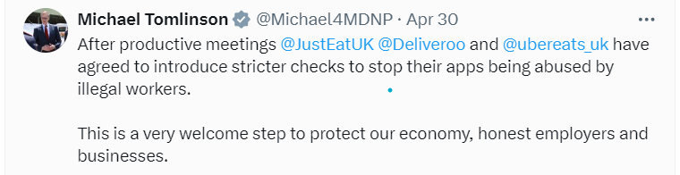 At Uber Eats we are going to roll out identity verification checks to help ensure only those who legitimately use someone else’s account to earn with us are able to, and we are pleased to be working with government to find a solution.